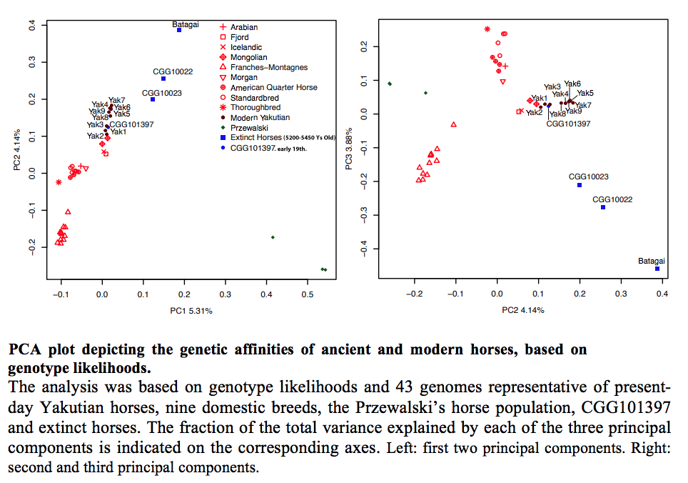 To date, the genomic diversity of Yakutian horses is mostly unknown, and genetic analyses are limited to few microsatellites and mtDNA sequences. In this study, we have sequenced and analyzed the complete genomes of 11 Yakutian horses, including nine present-day horses and two ancient specimens that lived in the region ∼5,200 y ago and in the early 19th century. The results revealed a genetic discontinuity between the Pleistocene and mid-Holocene genomic landscapes, showing that the contemporary population fully descends from a stock of domesticated horses. Taken together, these findings support the predominant hypothesis that the Yakut people introduced the breed in the 13th–15th centuries, and implies that the unique genetic adaptations of Yakutian horses, which we reveal here for the first time to our knowledge, were selected on an extremely short evolutionary time scale."